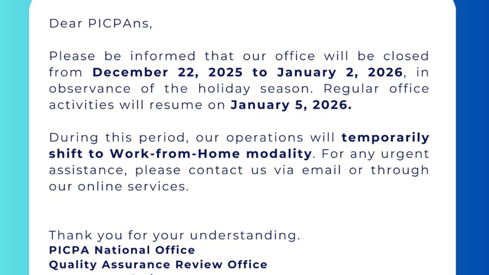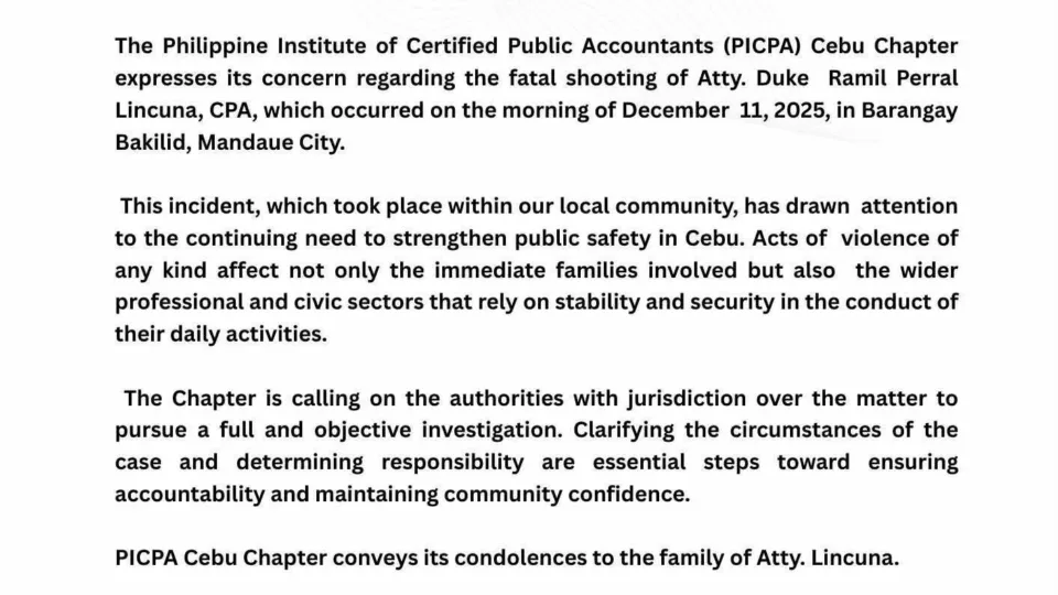 The Philippine Institute of Certified Public Accountants and PICPA Cebu Chapter extends its heartfelt condolences to the family of Atty. Duke Ramil Perral Lincuna, CPA. We condemn this act of violence and call for a thorough investigation to ensure accountability.