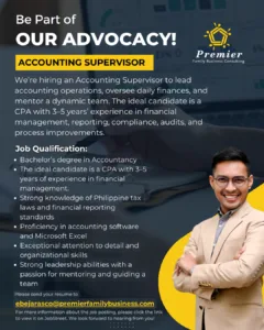 ACCOUNTING SUPERVISOR | Premier Family Business Consulting Email: ebejarasco@premierfamilybusiness.com Contact No.: 9398884290 Address: 35F 35th Floor Cebu Exchange Tower, Salinas Drive, Lahug, Cebu City Contact Person: Ernie Rose G. Bejarasco ![]() |